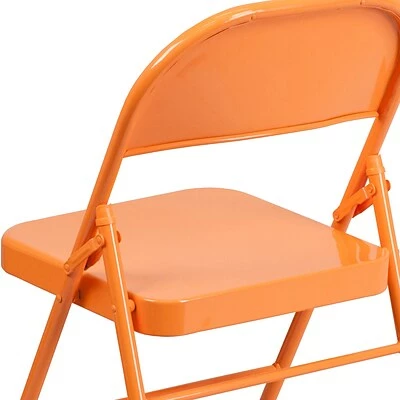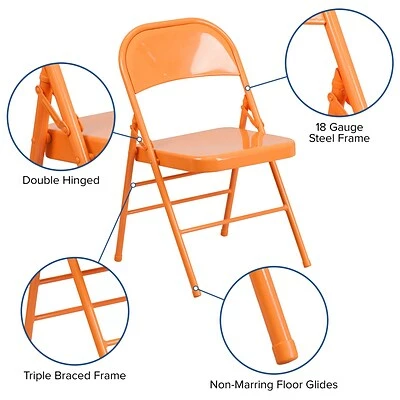 Commercial-grade metal folding chairs are designed to be lightweight but durable. This product is engineered and built with premium materials and boasts riveted steel components that will withstand heavy duty use for event, business, and home usage. These metal folding chairs feature premium 18 gauge curved steel frames and double-hinged frames for worry-free seating. With a variety of vibrant color options, you can choose what would best pair with your event needs. This is a commercial-grade on-demand seating solution convenient for weddings, school functions, barbecues, game nights, and catering events. Folding chair highlights: – Ready-to-use with no assembly required – Triple braced legs with integrated footrest – Suitable for indoor-outdoor use; Store indoors to protect frame from excessive moisture. – Floor caps to prevent surface and flooring damage – 300 lb. weight capacity- These low-maintenance party event chairs wipe down easily after luncheons and fold easily for storage, transport, or floor maintenance. Make a smart investment by purchasing multiple folding chairs for your rental business, waiting room, or corporate training rooms. Purchase our folding chair dolly for quick and easy setup and takedown.