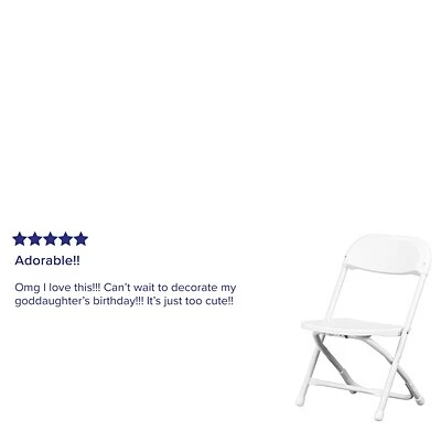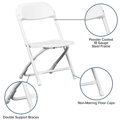 Flash Furniture Kids white plastic folding chair sold in 10 per pack features double rails with powder finish steel frame for support. Non-marring caps reduces floor damage. It is recommended for preschool kindergarten age.
