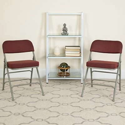 Guests will be amazed in the comfort of this Flash Furniture HERCULES Series ultra-padded upholstered metal folding chair. Whether you have planned for your guest’s arrival or had a sudden influx of family show up on your doorsteps, you’ll be well prepared with this padded folding chair. The chair provides comfort during extended meetings and social gatherings. Its 18-gauge curved powder-coated steel frame is triple-braced and double-hinged with leg-strengthening support bars to hold up to 300 lbs. Nonmarring floor glides on the legs protect your floors by sliding smoothly when you move it. Built for commercial use, this attractive chair is a smart seating solution for your next business meeting as well as in the home for family gatherings and other social events. After outdoor events, store indoors to protect the frame from extreme moisture. With nothing to assemble, this chair comes ready to service your needs.