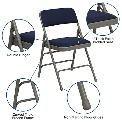 Constructed from a durable steel, powder-coated in gray, with a padded seat and back covered in navy blue fabric