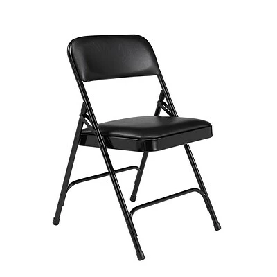 Our comfortable 1200 Series premium upholstered folding chair is made with the combination of durable vinyl wrapped over 1 ¼” of soft foam on our most popular frame. This institutional-grade chair features our unique full-size double-contoured backrest, upholstered and firmly secured to the frame with six rivets. The powder-coated steel frame made from heavy-duty 18-gauge round tubing and two U-shaped double-riveted cross-braces – one in front and two in the back – to securely support the double-hinged legs. Color-coordinated V-tip stability plugs provide added reinforcement at the frame’s junction and matching replaceable glides prevent floor damage. The 1200 Series meets MAS Certified Green and ANSI/BIFMA standards.
