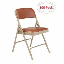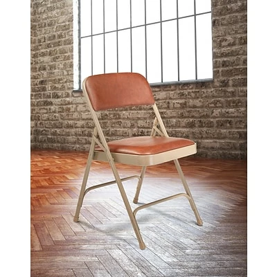 Our comfortable 1200 Series premium upholstered folding chair is made with the combination of durable vinyl wrapped over 1 ยผโ of soft foam on our most popular frame. This institutional-grade chair features our unique full-size double-contoured backrest, upholstered and firmly secured to the frame with six rivets. The powder-coated steel frame made from heavy-duty 18-gauge round tubing and two U-shaped double-riveted cross-braces – one in front and two in the back – to securely support the double-hinged legs. Color-coordinated V-tip stability plugs provide added reinforcement at the frame’s junction and matching replaceable glides prevent floor damage. The 1200 Series meets MAS Certified Green and ANSI/BIFMA standards.