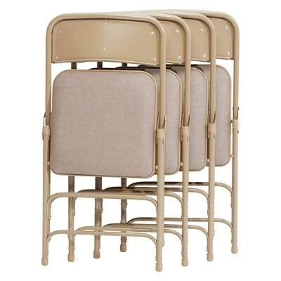 Beige 18 gauge triple brace steel frame upholstered with soft café beige colored fabric covering plush foam