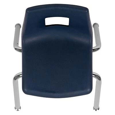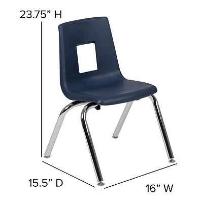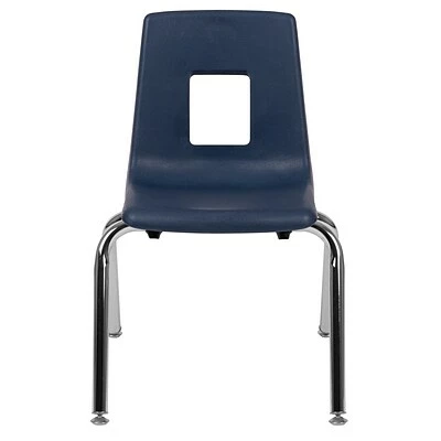 These well constructed, stackable school chairs provide an unparalleled level of durability and value to exceed your classroom seating needs. The classroom oriented Advantage Student Stack school chair features a heavy-duty navy blue seat shell made of superior high-density polypropylene, ergonomically shaped for maximum student seating comfort and 18 gauge bright nickel, chrome plated frame. These school chairs provide a stylish and durable classroom seating solution. Each seat shell is designed to promote student seating comfort and correct seating posture for enhanced learning. Non-exposed rivets hold the school chair shell to the strong, non-corrosive steel frame while nylon tip glides on each leg help protect delicate floor surfaces. These school chairs are stackable up to 12 units high to provide ease of cleaning and maximum storage within the classroom.