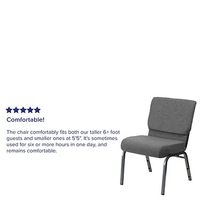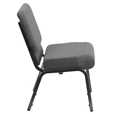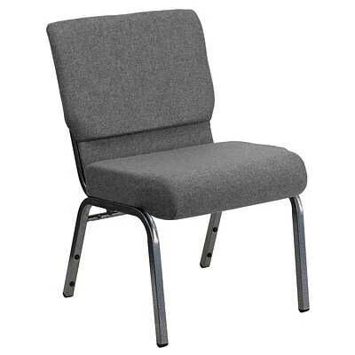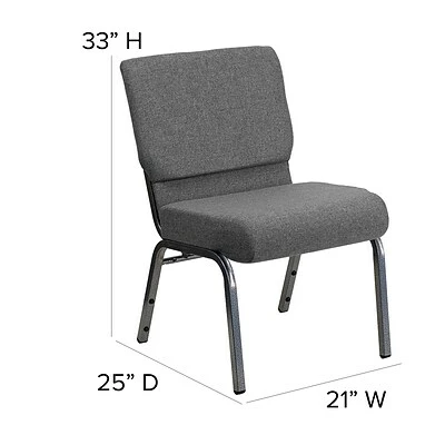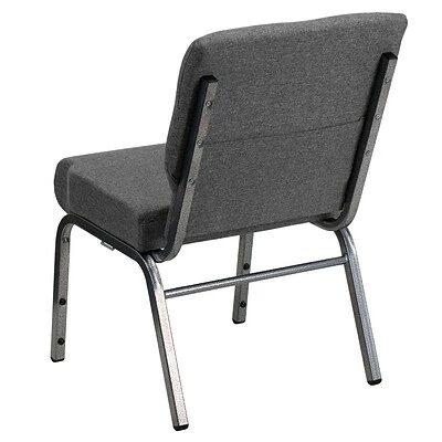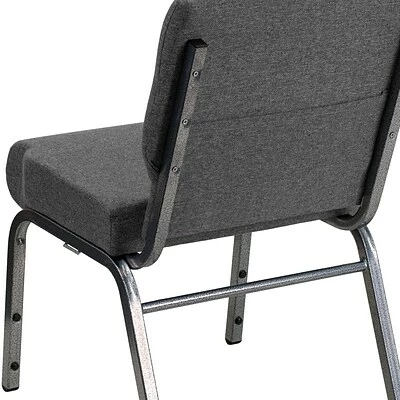 Flash Furniture HERCULESโข 21” extra wide Stacking church chair is gray fabric upholstery made with 3.75” thick seat and silver vein frame finish. Chair with ganging clamps has waterfall seat that reduces leg strain.