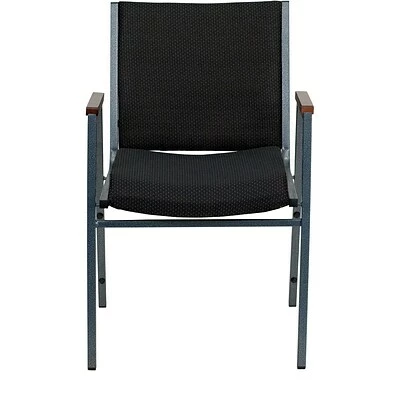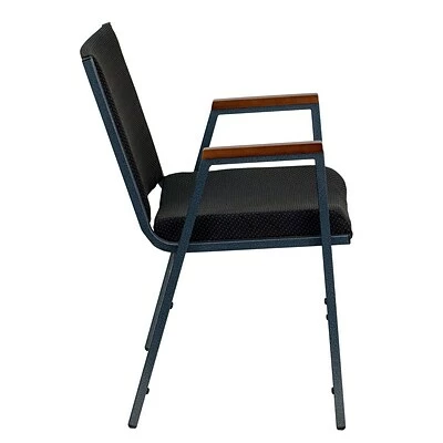 Flash Furniture HERCULESβ’ Heavy duty multi purpose stack chair with arms features 18 gauge high carbon steel for stability. Chair is made of black patterned fabric upholstery with 3” thickly padded seat offering comfort.
