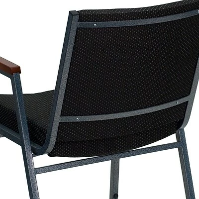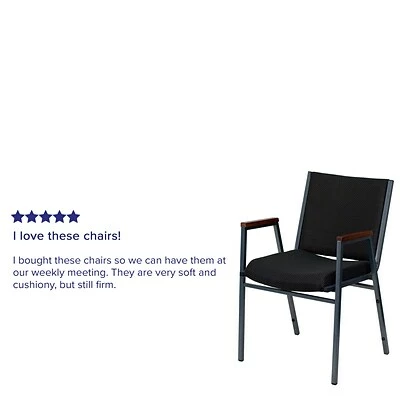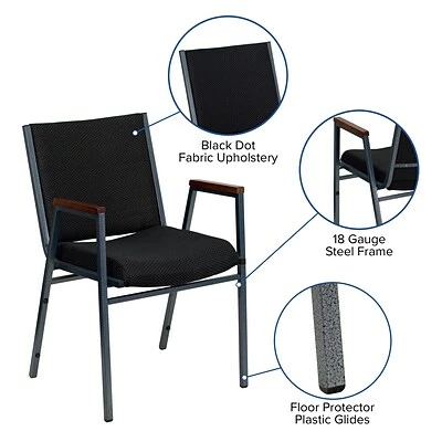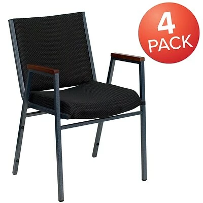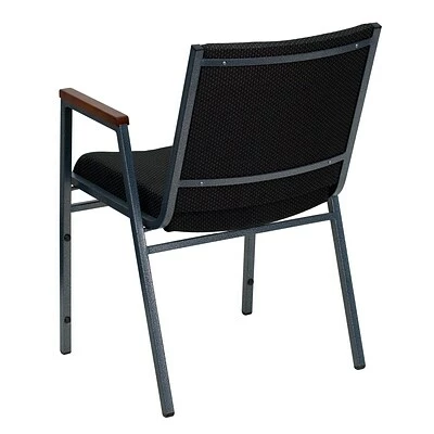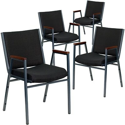 Flash Furniture HERCULESβ’ Heavy duty multi purpose stack chair with arms features 18 gauge high carbon steel for stability. Chair is made of black patterned fabric upholstery with 3” thickly padded seat offering comfort, sold as 4 per pack.