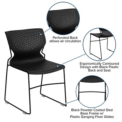 If you’re looking for modern yet flexible seating for the front office of your business this sled base stack chair will outshine. This chair is highlighted by a deep curved back for lumbar support in a perforated design. Stack chairs are a popular choice in many industries, including the home for their compact and portable design. Furnish any high traffic space with this plastic guest chair, the plastic surfaces are easy to maintain in busy lobbies and cafeterias. The heavy-duty plastic stack chair is sturdy in construction to withstand frequent stacking. After use in temporary settings such as multi-use meeting spaces or school functions this chair stacks up to 25 chairs high. To make transporting even easier, equip yourself with our compatible sled base stack chair dolly. When in need of a space-saving seating solution that is permanent or temporary, allow this stackable side chair to work for you.